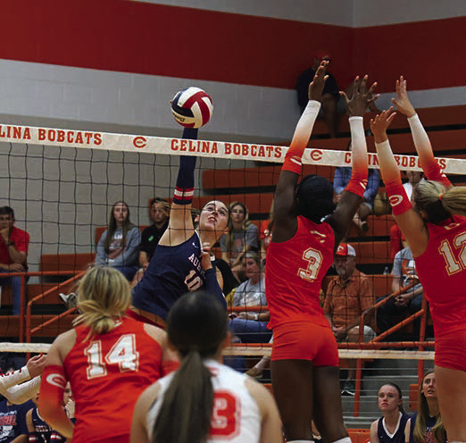 Lady Chaps outside hitter Libby Collins spikes a kill during Aubrey’s match against the Celina Lady Bobcats. Celina won the first set, but Aubrey battled back to win the next three and the match 3-1 on Tuesday. Martin Edwards/The Post-Signal