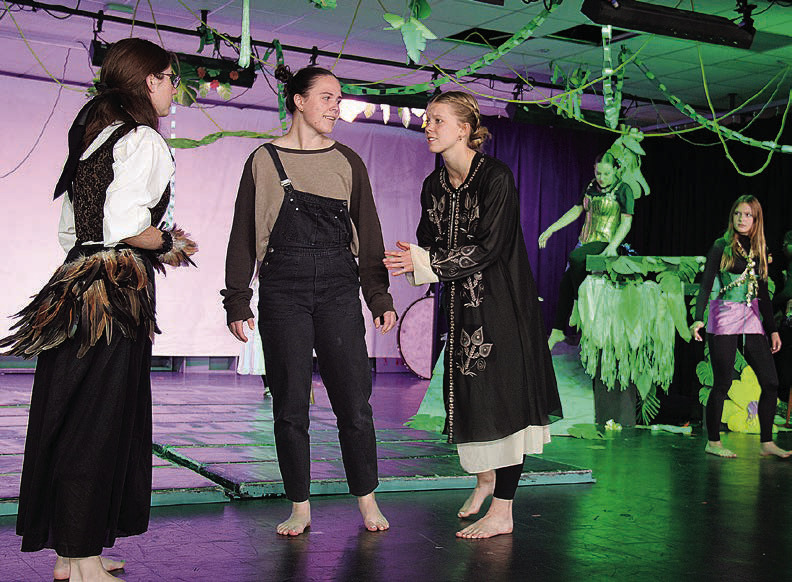 Chil the Kite, played by Noelle Furlong, tells Baloo (Amelia Strittmatter) and Bagheera (Kendal Kearns) where Mowgli is as Kaa listens.
