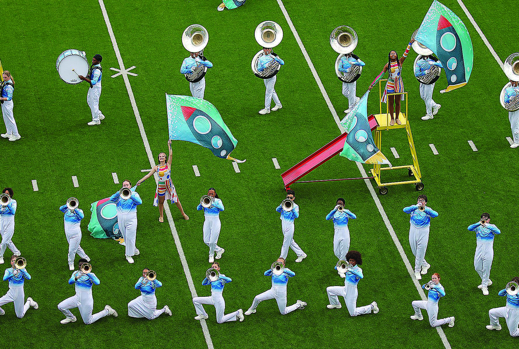 The Aubrey High School Chaparral Marching Band puts on a colorful and playful performance in its show, 'The Playground.' The AHS band, led by Jason Noyes, received a 1 on Saturday, earning a trip to Area.