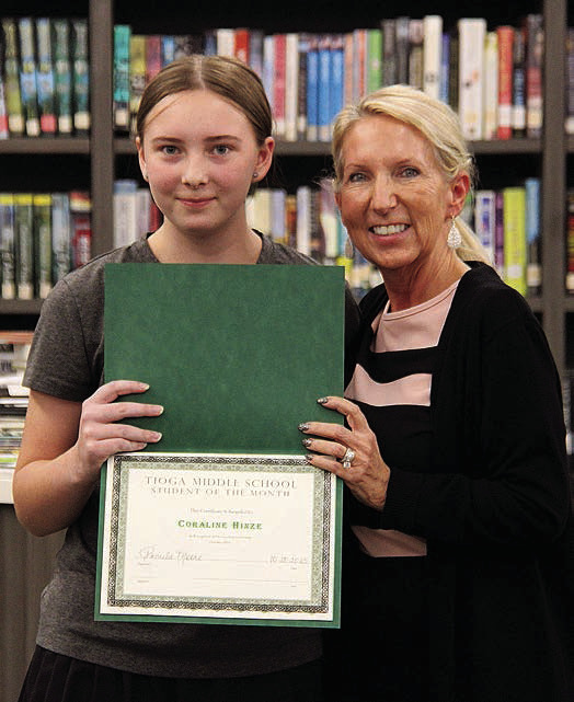 Tioga Middle School student Coraline Hinze also receives a student of the month award from Principal Pamela Moore at the Oct. 20 meeting.
