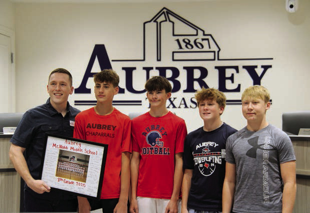 Council member Matt Jones also received a special award from a contingent of Aubrey ISD middle school athletes for donating food for the middle school football games for two seasons.