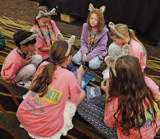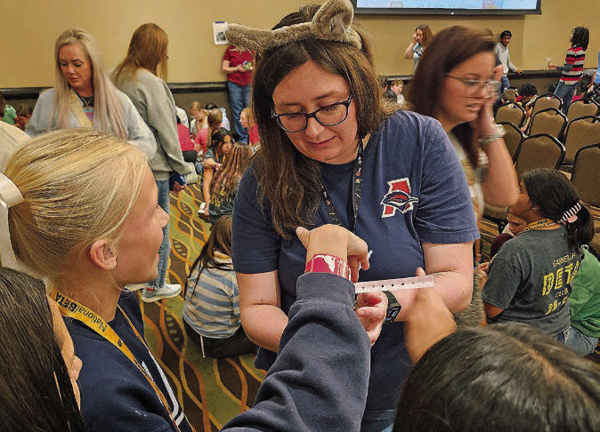 Owens Middle School sponsor Kyndal Brown shows the students how to work one of the science experiments that the students worked together to complete during the Beta Leadership Summit at the Great Wolf Lodge.
