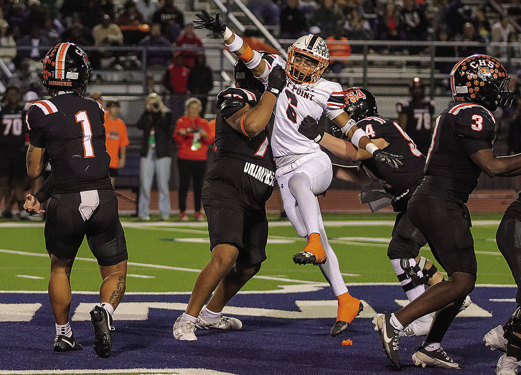 Pilot Point defensive end Jason Rangel reaches for Commerce quarterback Aidan Brown while fighting through two Tiger blockers. Janette Pool/ The Post-Signal