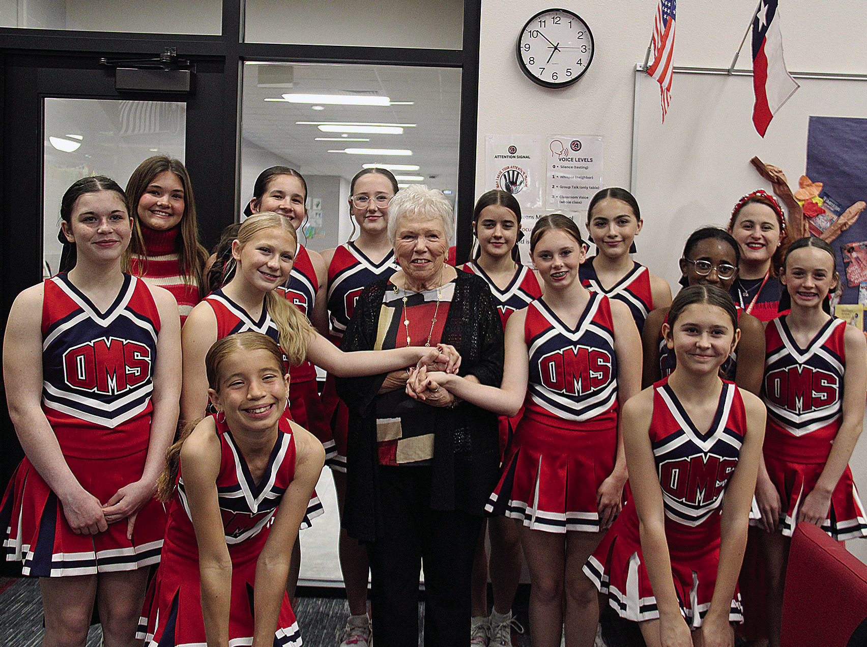Evalois Owens smiles for a picture with the cheerleaders who attend Owens Middle School and their sponsors after the school's dedication ceremony on Nov. 20. Abigail Bardwell/ The Post-Signal