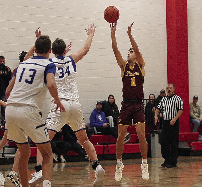 Pirates point guard Chad Davidson pulls up for a jumper over the outstretched arms of a Wolves defender at the For the Love of the Game Tournament on Dec. 4. Collinsville beat Wolfe City 78-58, finishing 4-1 at the tournament.