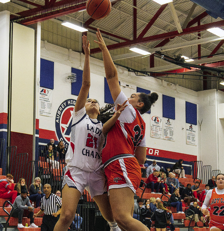 Lady Chaps forward Evelyn Retana is met at the rim by Lady Cats defender Alliyah Smith. Martin Edwards/ The Post-Signal