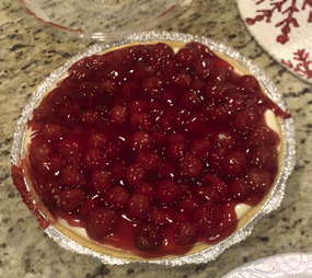 8. When you wake up, open the fridge and pour the 21 oz. can of cherry pie filling on the pie and put it back inside the fridge so it can form with the pie.