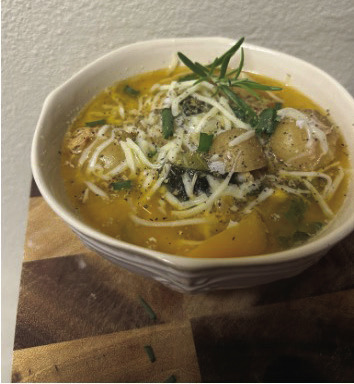 7. Add the rest of the veggies, chicken, chicken broth and water to the pot. Bring it to a boil for a few minutes and then bring the heat down to a rolling simmer, covered until the veggies are softened.