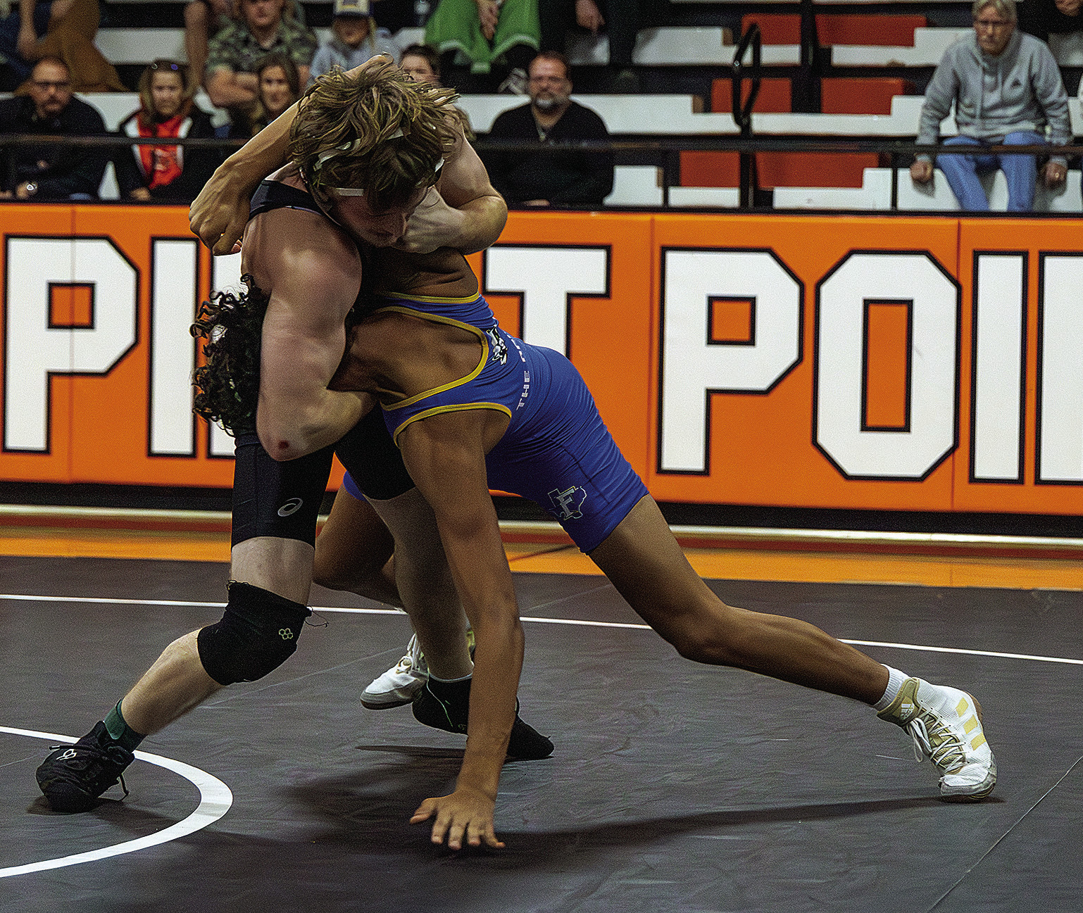 Bearcat senior grappler Augustus Westbrook takes down his opponent from Frisco High School during Pilot Point’s wrestling exhibition at Selz Middle School on Tuesday night. Martin Edwards/The Post-Signal