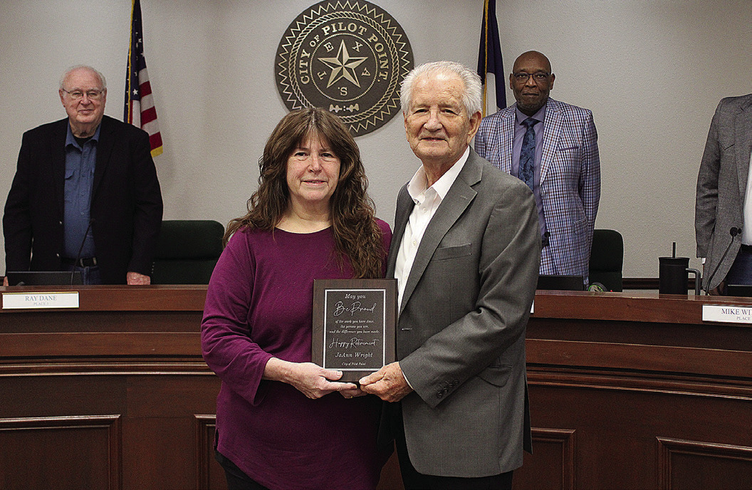 “You’ve done many, many jobs for the city of Pilot Point over the 26 years plus,” Gentry said. “It’s all well-deserved and recognized honor that we give you this plaque in commemoration of your retirement and years of service.”
