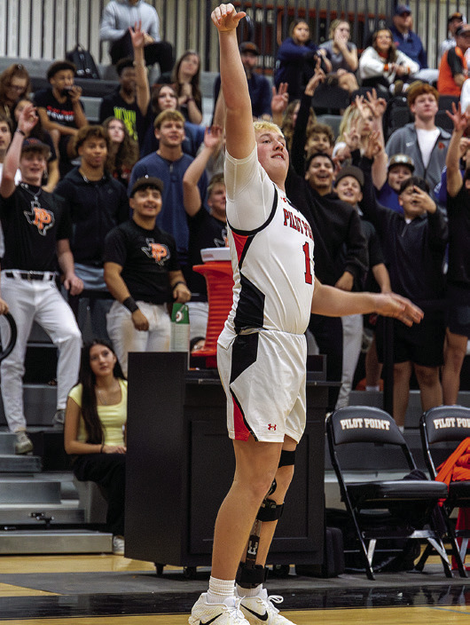 Pilot Point senior forward Kade Stuckly, who is recovering from an ACL tear, checks in for the first time this season on senior night and knocks down a corner three against Ponder on Feb. 13. Photos by Martin Edwards