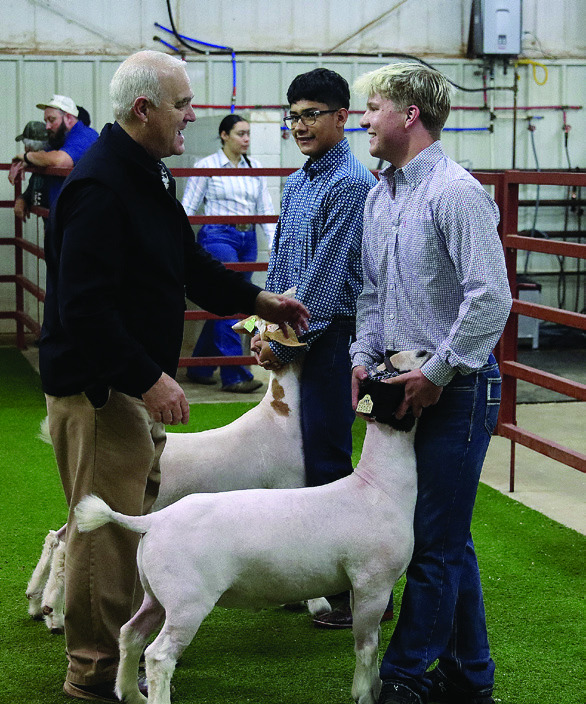 Pilot Point FFA member Garrett Evans, right, speaks with judge Dr. David Frazier as Julises Najera looks on.