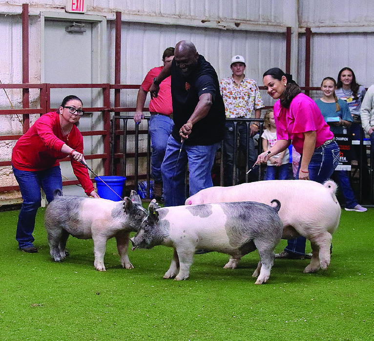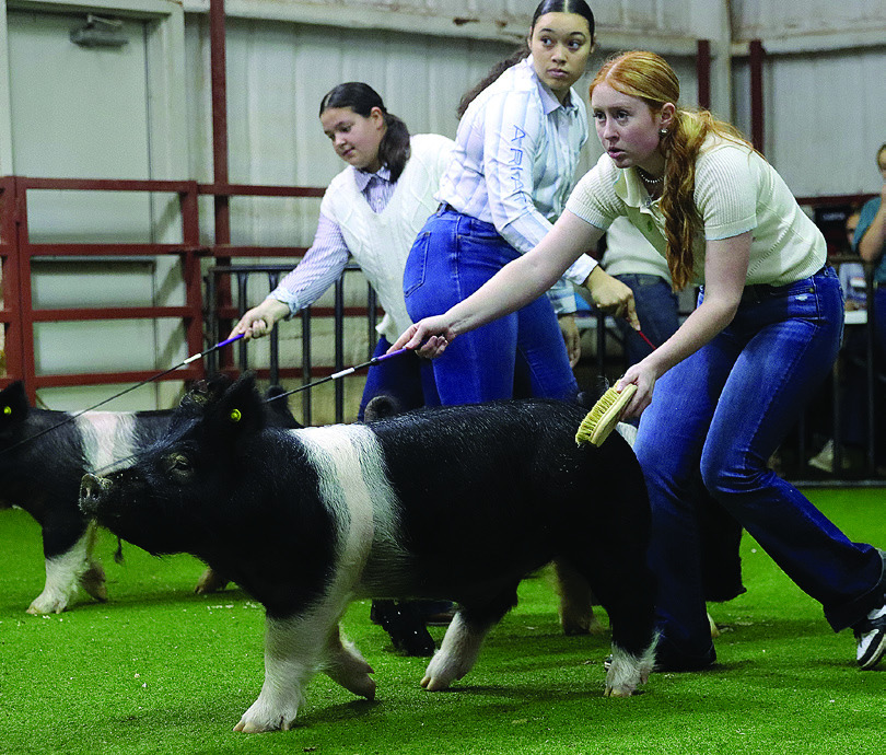 Pilot Point FFA member Brooklyn Renfro, right, looks up at the judge with her fellow Pilot Point FFA members Lillie Kirby and Alliyah Smith also in the ring.