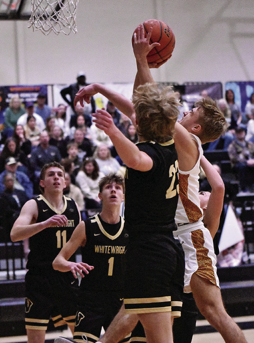 Pirates’ guard Chad Davidson slips through a crowd of Tiger defenders for a shot at the basket during Collinsville’s 72-65 bi-district win over Whitewright on Monday night. Photo courtesy of Christina Ragsdale