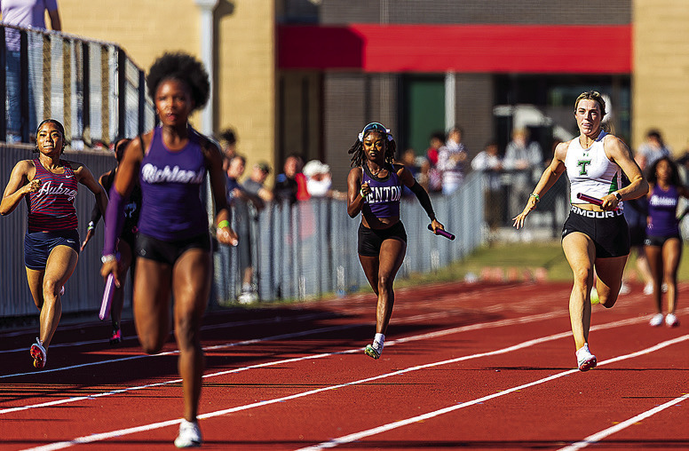 Aubrey and Tioga runners Chrisette Turner, left, and Kendall Whitley, far right, race toward the finish with a pack of runners during one of the relay races at the Runnin’ Chap Relays. Bill Norwood/The Post-Signal