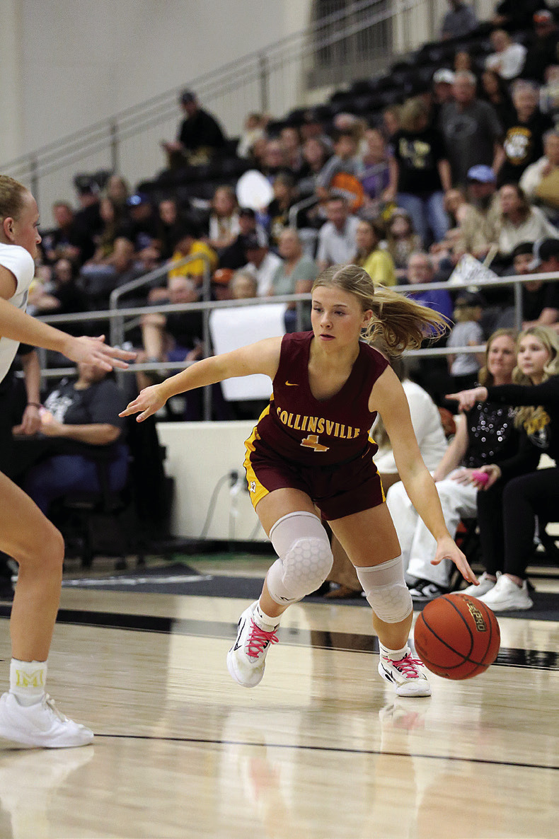 Lady Pirates guard Paige Davidson drives around a Cisco Lady Loboes defender. Cisco defeated Collinsville 54-45 in the regional finals Feb. 27, ending the Lady Pirates’ season at 33-4.