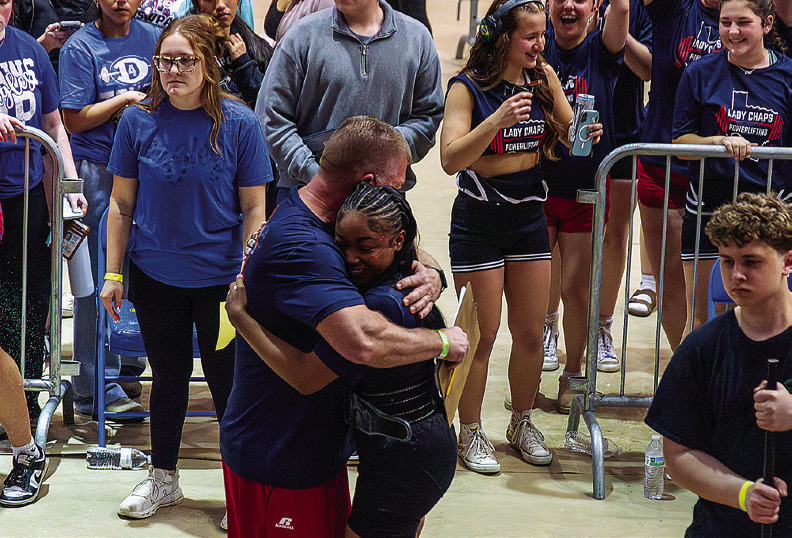 Aubrey head girls powerlifting coach Ron Gathright embraces Lady Chap Alaya Harnett after she powered her way to a silver medal finish at the regional meet Feb. 27. Martin Edwards/The Post-Signal