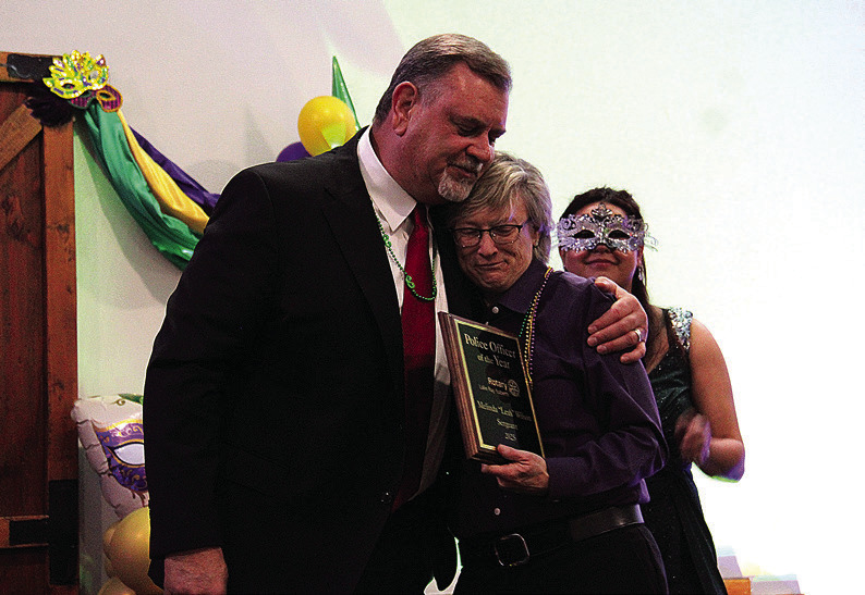 Sgt. Leah Wilson gives Pilot Point Mayor Chad Major a hug after he named her as the Lake Ray Roberts Rotary Club's Pilot Point Police Officer of the Year on Saturday.