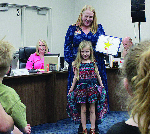 Pilot Point Early Childhood Center Principal Andrea Kenndey presents kindergarten student Scarlet Hunter with the Pilot Point ISD Star Student award. Paisley McGee/The Post-Signal