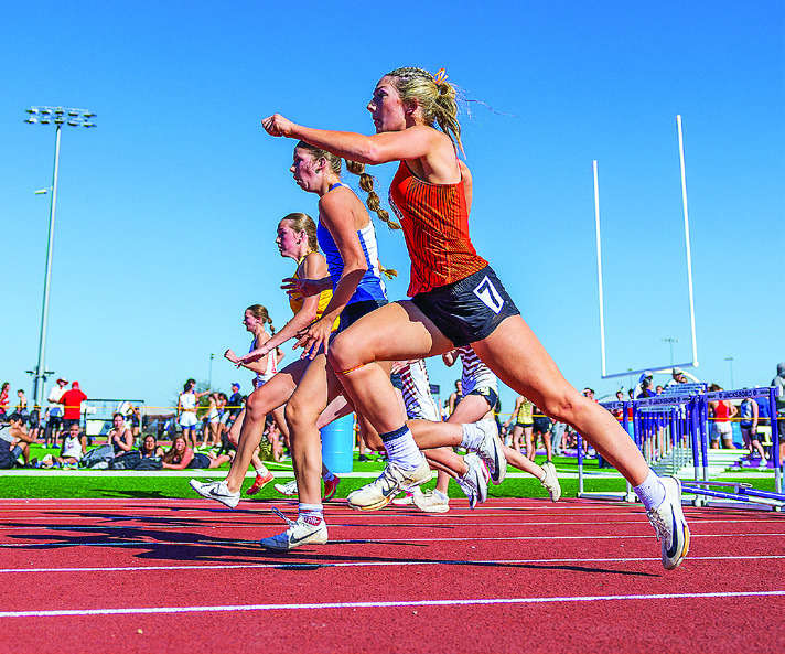 Lady Cat Laney Scott races down the track during the 100-meter hurdle event. Scott finished third in the event.
