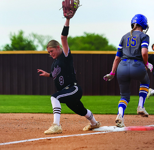 Lady Pirates first baseman Hailey Germany reaches out to snag the throw to first during 11-6 loss to the Dodd City Lady Hornets on Tuesday. Photos by Jenna Howard/ The Post-Signal